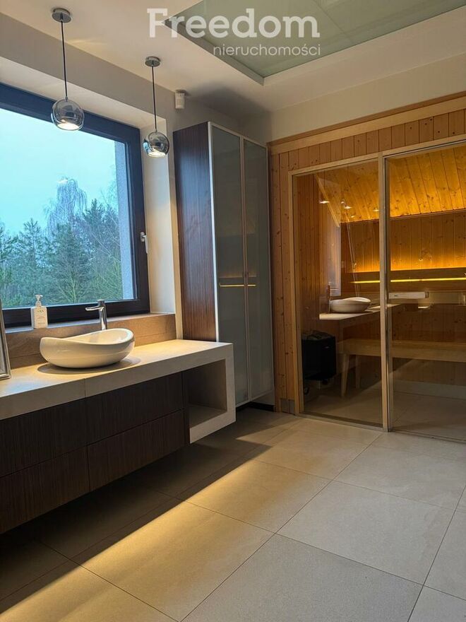 łazienka z sauną oraz praktyczne dodatki jak pralnia i garderoby.